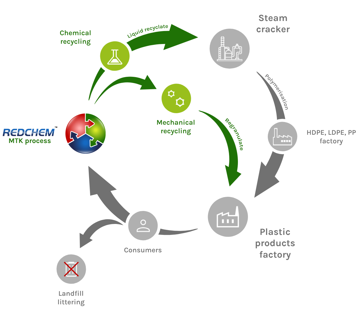 REDCHEM applies MTK, its proprietary hybrid recycling solution, which combines technologies such as mechanical recycling and pyrolysis. From its inception, the REDCHEM team has also been working on developing energy self-sufficiency.